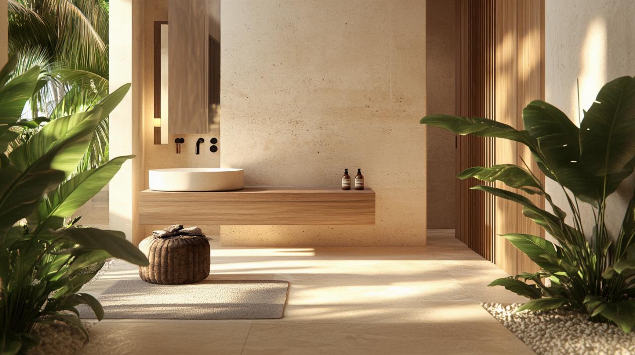 L'intégration du bois dans une salle de bain en travertin permet de décliner plusieurs styles décoratifs. L'approche minimaliste privilégie des lignes épurées avec un meuble vasque blanc et design complété par des touches de bois clair pour une ambiance moderne. Le style zen mise sur l'harmonie des matériaux naturels avec des accessoires en bambou et une palette de tons neutres qui invitent à la méditation. Pour un rendu rustique chic, on optera pour un travertin à finition brute associé à des poutres apparentes et du mobilier en bois massif patiné. Le style contemporain joue sur le contraste en associant travertin clair, mobilier noir et accents métalliques pour un résultat résolument actuel.